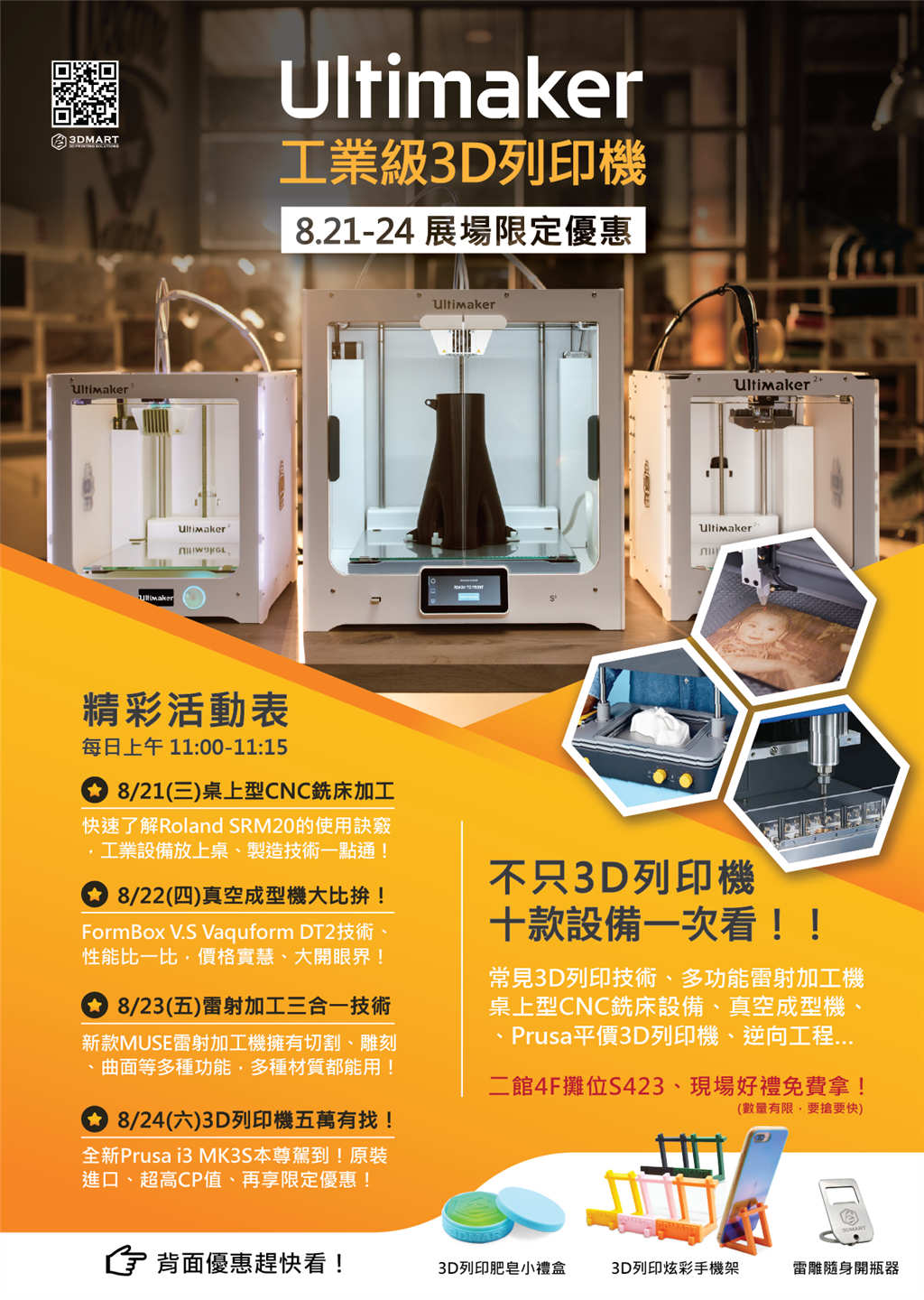 前陣子公告的8/1~8/24 3D列印展正式展開!今天前往南港展覽館的捷運上就被擠的水洩不通,從一樓到四樓都有精彩自動化、模具、3D列印等新技術可以看;不但Ultimaker 3D列印機有破天荒的優惠方案四選一,現場其他設備也都各有不同優惠,甚至包含平價的Prusa 3D列印機!倒數三天、把握展期快點來逛!