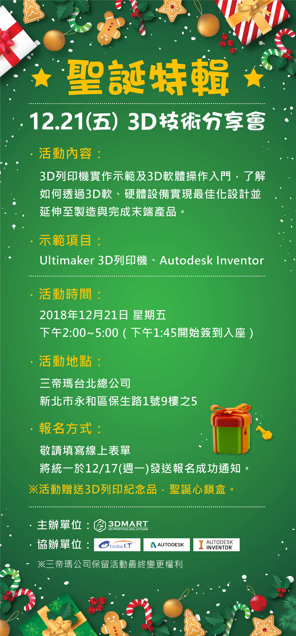 【3D列印活動】聖誕特輯:「3D技術分享會」開放報名!額滿為止! 三帝瑪和你一起歡喜迎聖誕~今年12月21日(五)我們將與大塚資訊科技共同舉辦3D技術分享會! 現場除了能了解不同3D列印技術及應用範圍、各式樣品以外,還有3D列印機的實際操作(教學原價3000元以上)以及3D軟體Autodesk Inventor入門及應用示範(本次主題:透過 Autodesk Inventor 實現最佳化設計並延伸至製造)。 分享會於下午1:45開放簽到入座,並於2:00開始至5:00結束,一場3小時的活動讓你一次獲得3D列印的軟、硬體知識,掌握從想像到實踐產品的串接流程,以及活動現場購機優惠。 同時,三帝瑪將於現場贈送聖誕特輯紀念品──3D列印心鎖盒(介紹影片這裡看),讓你送禮沒煩惱!快來一起長知識、拿好禮,一次滿足多種需求!座位有限,額滿為止! 本次活動您將會獲得: .3種3D列印技術比較及知識 .Ultimaker 3D列印機實際操作 .3D建模軟體Autodesk Inventor入門教學 .了解如何從建模軟體到實際使用3D列印生產 .活動限定購機優惠 .聖誕特輯.心鎖盒送給你 ※三帝瑪將於12月17日(週一)統一寄送報名成功通知,敬請留意信件回函。 依報名優先順序為主,報名額滿恕不另行通知。 .活動時間:12月21日 下午2:00~5:00(共3小時) .活動地點:三帝瑪臺北總公司(新北市永和區保生路1號9樓之5) .立刻點我報名! *將統一於12月17日以E-mail寄送報名成功通知 追蹤粉絲專頁、抓住3D技術:https://www.facebook.com/m.88778853.com/
