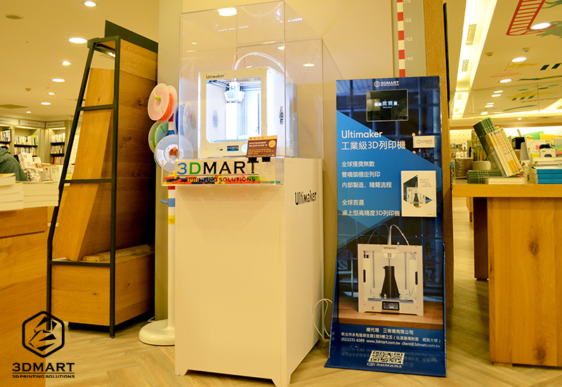 走進(jìn)誠品大門後會看到柱子中央有我們Ultimaker的展示牆,3D列印機(jī)會持續(xù)運(yùn)轉(zhuǎn)中,還沒看過的朋友可以一睹它的風(fēng)采。旁邊也展示了FDM的專用線材、影片介紹3D列印機(jī)在工業(yè)環(huán)境中的使用情況,讓小朋友能更加了解3D列印的周邊應(yīng)用;另外我們也特別降低了展示的高度,希望讓大人小孩都能看的到。