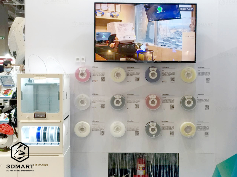 繼續往展區側面參觀,可以看到五顏六色的Ultimaker 3D列印線材牆,展期中也有觀眾特別前來詢問,想了解每種材質的差別,牆面上每捲線材旁都附有專屬QRcode,輕鬆掃描後就能得到詳細的規格、資料,清楚又方便!(點我看:3D列印線材比較指南)