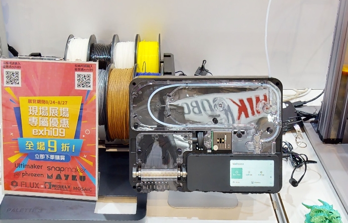 這次特別在攤位上我們獨家展出,「Mosaic 線材調色盤Palette 3 Pro」,擁有8種多色拼接,多色3D模型一次印到好!並且將線材準確、低電阻的裁切,確保乾淨不殘留。(點我看:【開箱影片實測】Mosaic線材調色盤Palette 3 Pro實測:超萌壞蛋來襲!打造自己的壞壞軍團!8色全彩列印!)