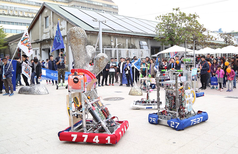 戶外廣場區(qū)除了展演舞臺(tái)以外,還有學(xué)生主導(dǎo)的機(jī)械車競賽,許多更加裝機(jī)械手臂,具備堆高、取物等操作能力,這些青年學(xué)子都是臺(tái)灣的後起之秀!