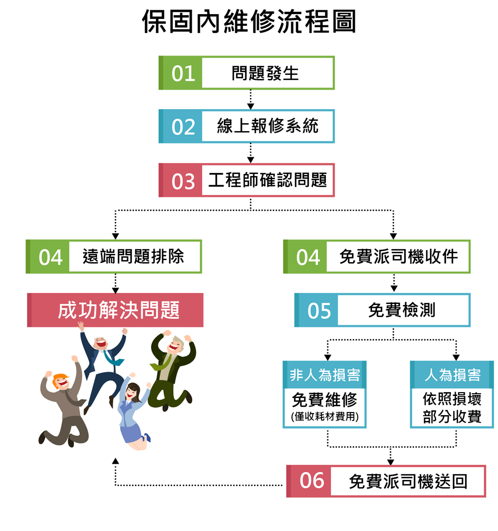 1. 維修商品將以原廠認可的專業設備處理,並由工程師依據案件排程進行檢測。