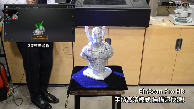 逆向操作!我們還使用Shining Einscan Pro HD手持高清模式,針對(duì)死侍模型進(jìn)行3D掃描(點(diǎn)我看:死侍3D掃描完整記錄),環(huán)繞掃描模型的每個(gè)面向,可以依照模型大小自由移動(dòng),掃描範(fàn)圍廣泛不受限;3D掃描物是黑色布料、透明玻璃、金屬反光等會(huì)影響光照結(jié)果的材質(zhì),別擔(dān)心!只要在表面噴上掃描噴粉顯像劑,就可以順利進(jìn)行掃描!