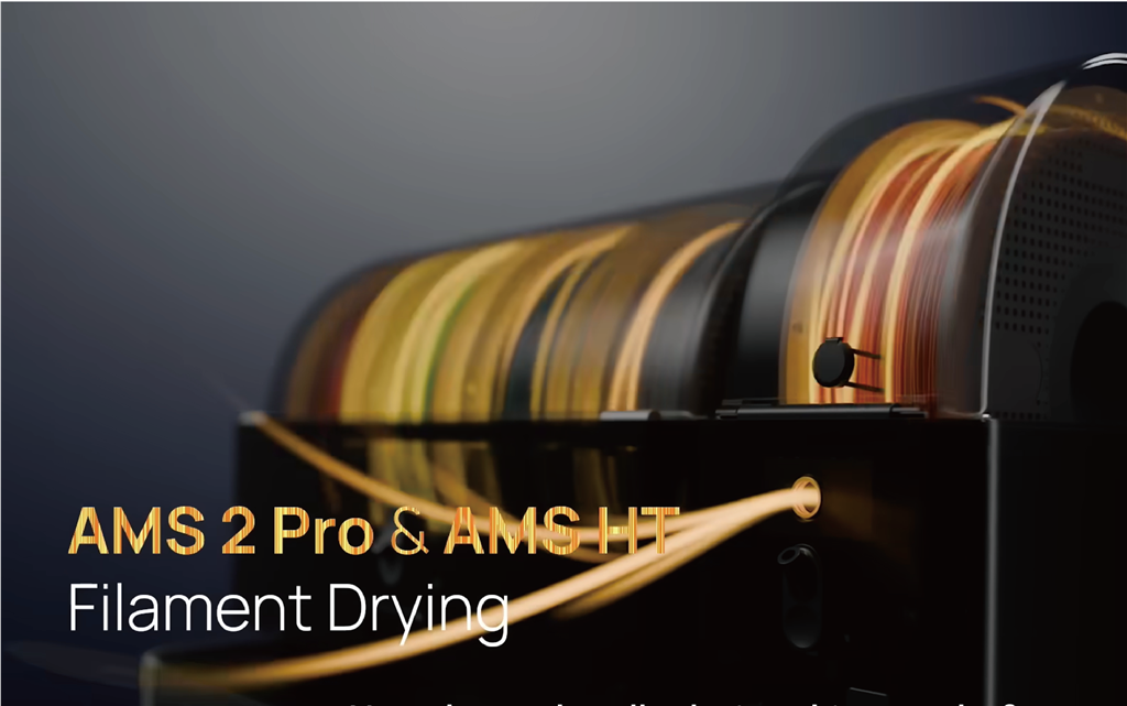 AMS 2 Pro 可加熱至 65 ºC 來乾燥線材,並透過列印機或手機或電腦上的軟體進行控制。