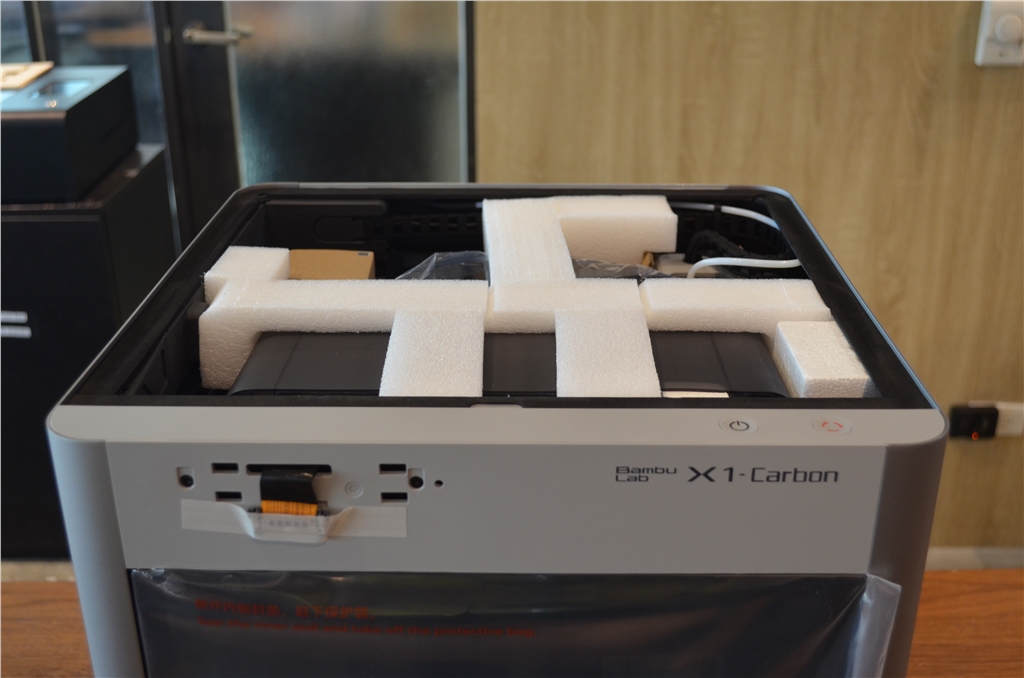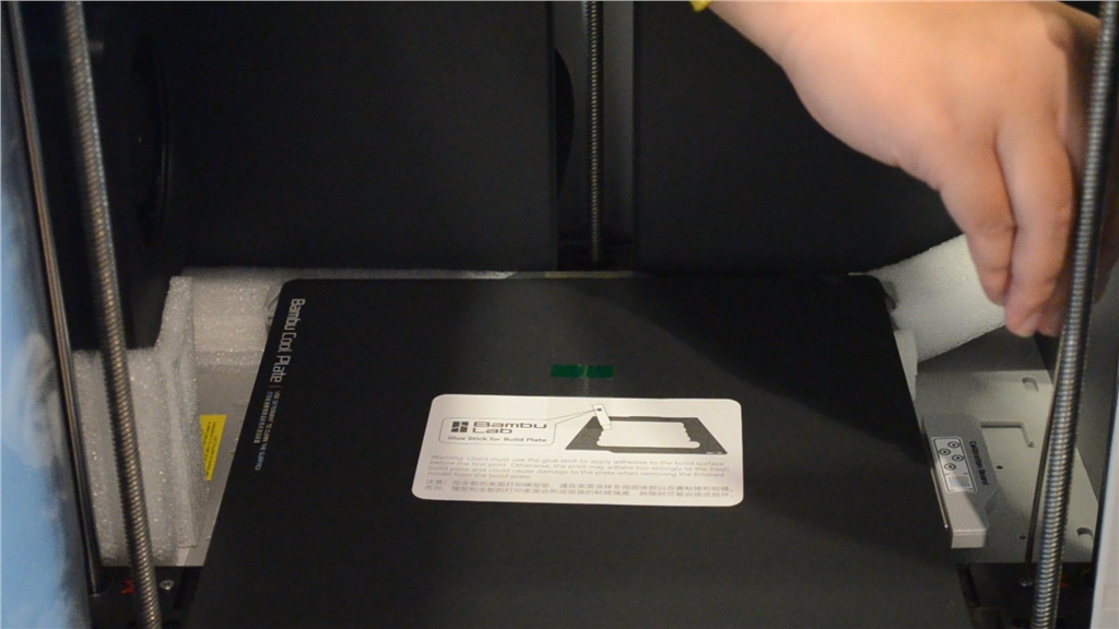 打開玻璃門,下方有紅色箭頭,兩個螺絲需要先轉開。AMS就可以從上方取出。撕下列印頭的保護紙板,取出線材清洗槽的泡棉。
