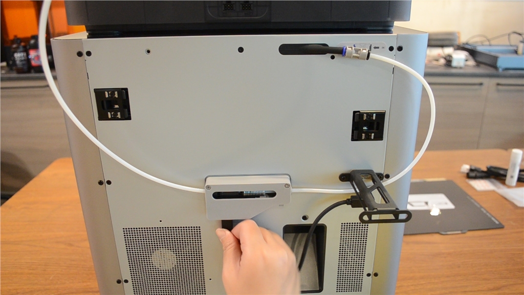 撥開白色部分的線材進口卡榫,將線材插入一定長度即可,AMS會自動偵測線材材質。