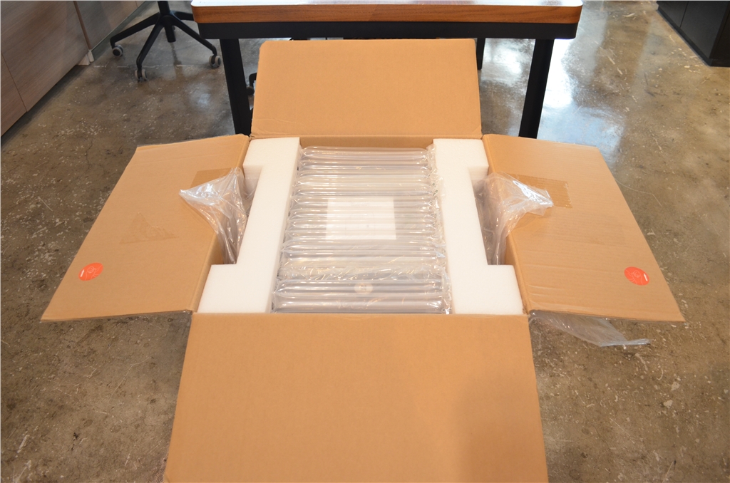 開箱時,將兩個泡棉拿起。箱子上有兩個箭頭,將兩邊塑膠外帶撕起,拉起兩邊即可將設備拉出外箱。