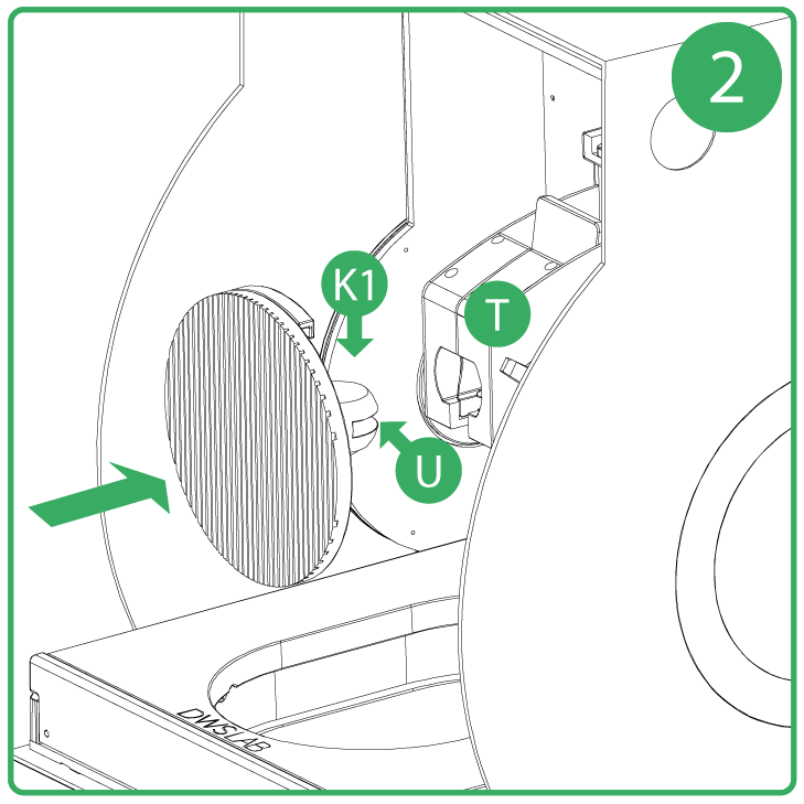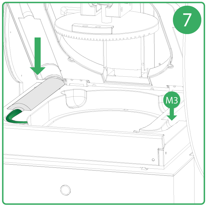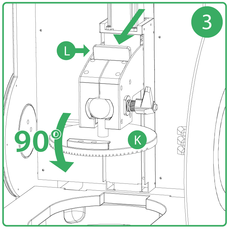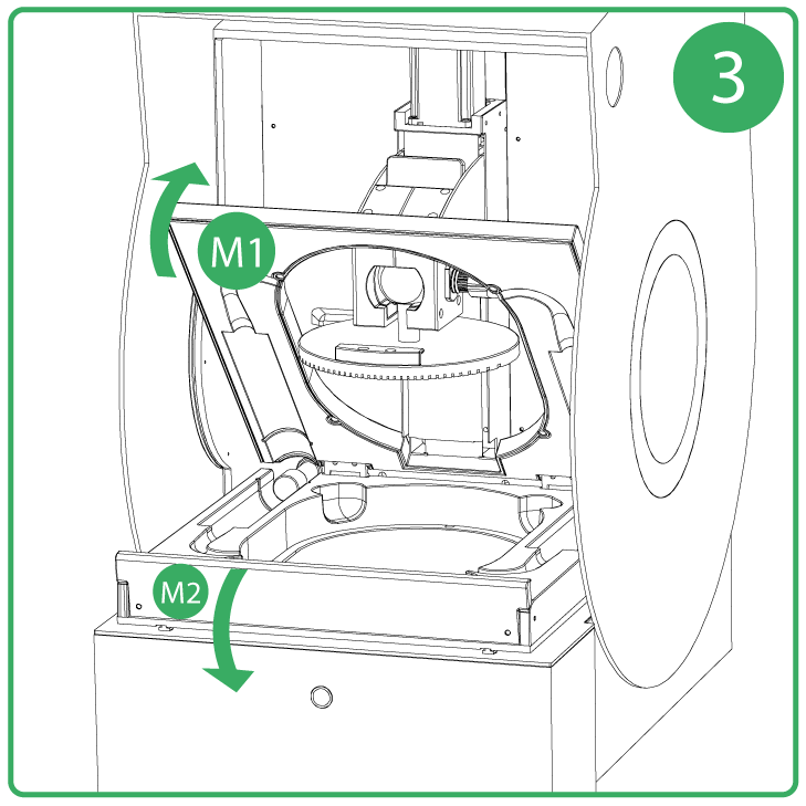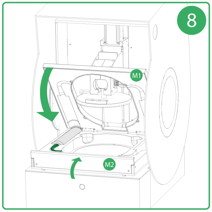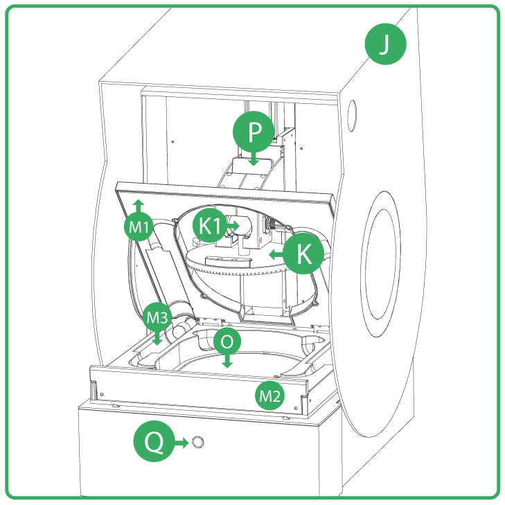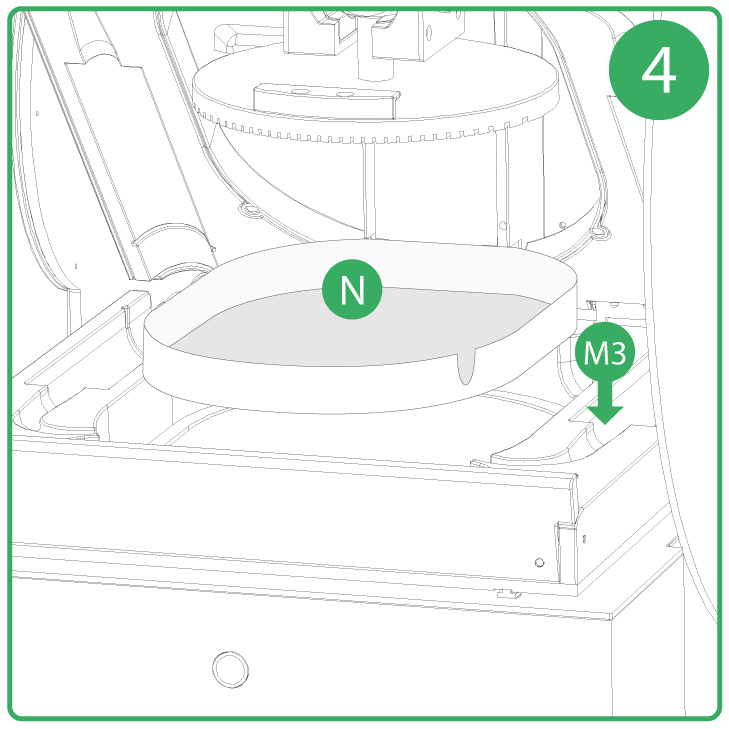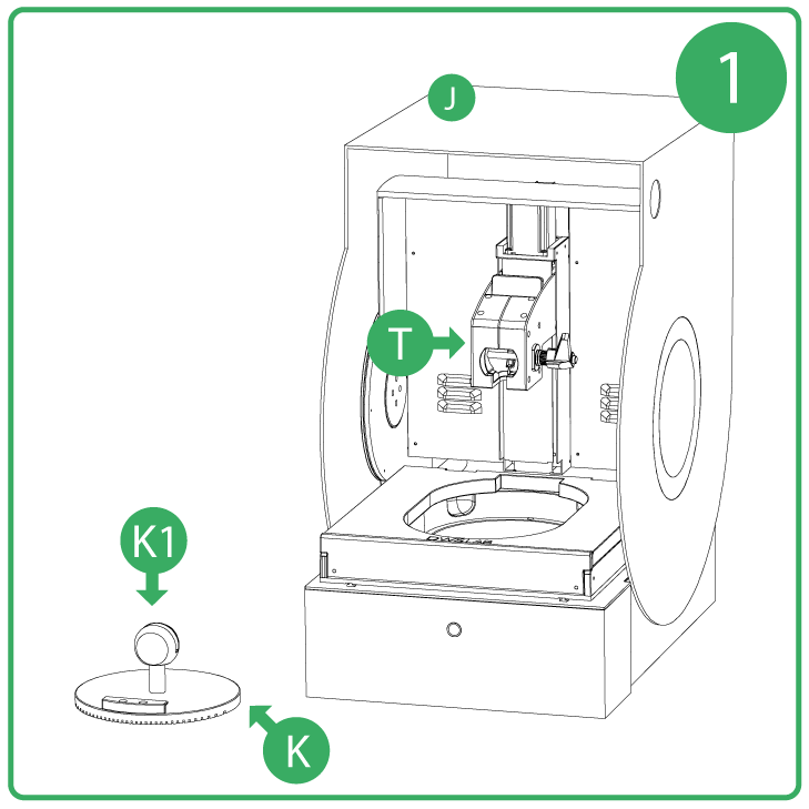 九、列印準備 ①3D列印機啟動 1. 打開列印機,啟動Fictor並按開門鍵(“Open”)。 2. 提起列印機遮罩(J)。 3. 將固定樹脂匣(M1)上蓋的樹脂盒卡扣(M2)往使用者的方向拉起。 4. 將樹脂槽放入列印機內(N),確保凹槽與樹脂匣(M3)的外殼吻合。 5. 搖晃樹脂並取下樹脂頂部的綠色蓋子(R)(不要取下保護膜)。 6. 將噴嘴(S)按壓到位,直到完全插入,然後如圖所示旋轉噴嘴。 7. 按照標籤上的說明(要列印在樹脂標籤上的指示後要檢查的項目6和7)將樹脂插入樹脂匣(M3)中。 8. 按下樹脂匣上蓋(M1)將其關閉。檢查樹脂盒卡扣(M2)確認上蓋已被鎖定。 ②平臺定位(移除階段) 1. 檢查平臺是否乾淨,並使用專門提供的梳子和用酒精(乙醇)沾濕的無絨布清除乾燥的樹脂殘留物。 2. 將平臺旋鈕(K1)插入相應的孔洞(T),使U處於水平位置,然後按直到完全插入。 3. 向用戶方向拉動鎖定桿(L),使平臺移動旋轉到水平位置上(K)。 注意:在這個階段不要鎖定平臺。 4. 放下列印機遮罩(J)。