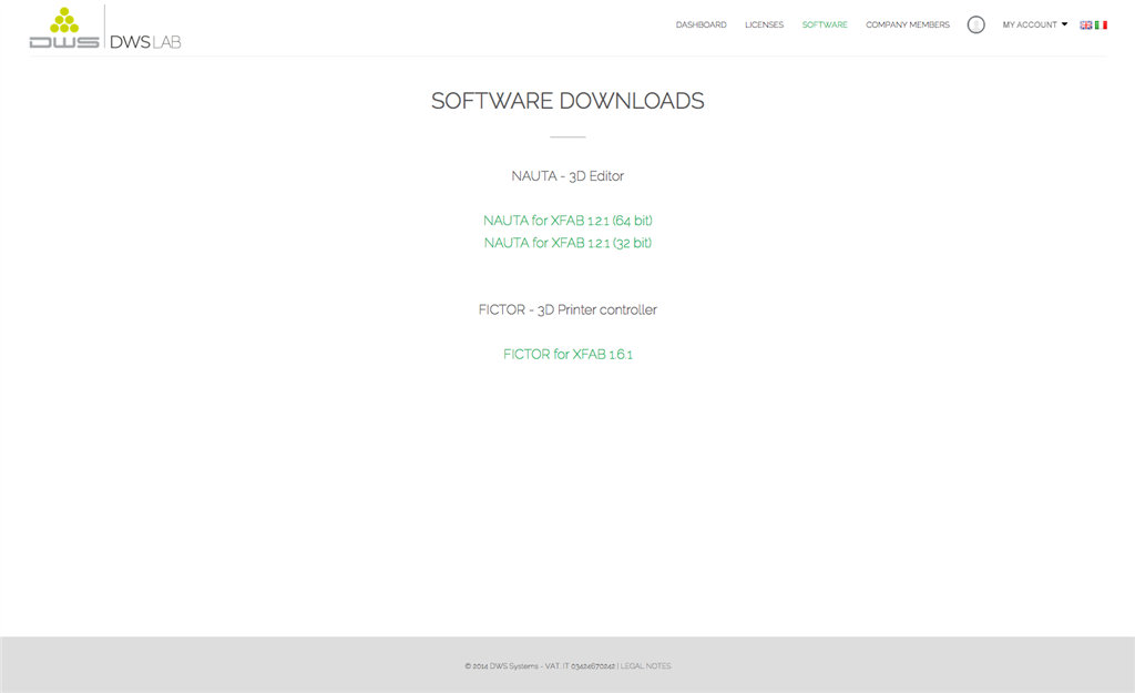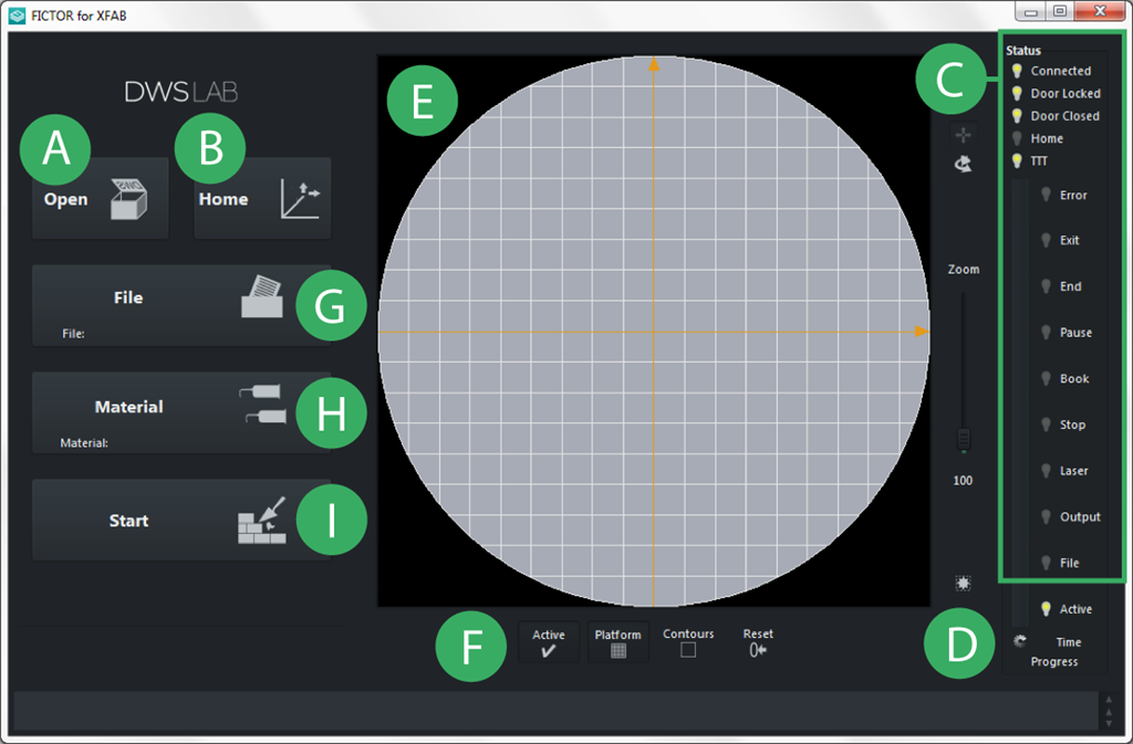 五、列印機管理 要下載列印機軟體,請按以下步驟操作: 1.前往customers.dwssystems.com頁面 2.如有必要,請點擊“Sign in”並輸入用戶名和密碼進行登錄。 3.點擊“Software”。 4.下載“Fictor”軟體(PC最低要求:Windows7 SP1或更高版本,OpenGL顯示卡,雙核處理器,USB連接端)。 5.下載“Nauta”軟體(*)(32位元或64位元,取決於操作系統)。 6.前往您的下載文件夾,點擊剛下載的安裝程式來進行安裝下載程序。 7.要索取安裝所需的代碼,請點擊“Licences”。 (*)查看“Nauta”軟體手冊,前往協助選單(View Help),在程式裡面。 初始化“Fictor”程式時(警告:初始化時程式可能請求管理員權限,Windows提示時回答YES),主螢幕將打開,並顯示以下: A. 打開外殼鑰匙。 B. 列印機初始化鍵。 C. 列印機狀態指示燈。 D. 列印狀態指示器。 E. 建模平臺顯示。 F. 顯示用戶設定控制區(參考E)。 G. 3D列印文件選擇鍵。 H. 列印材料選擇鍵。 I. 列印開始鍵。