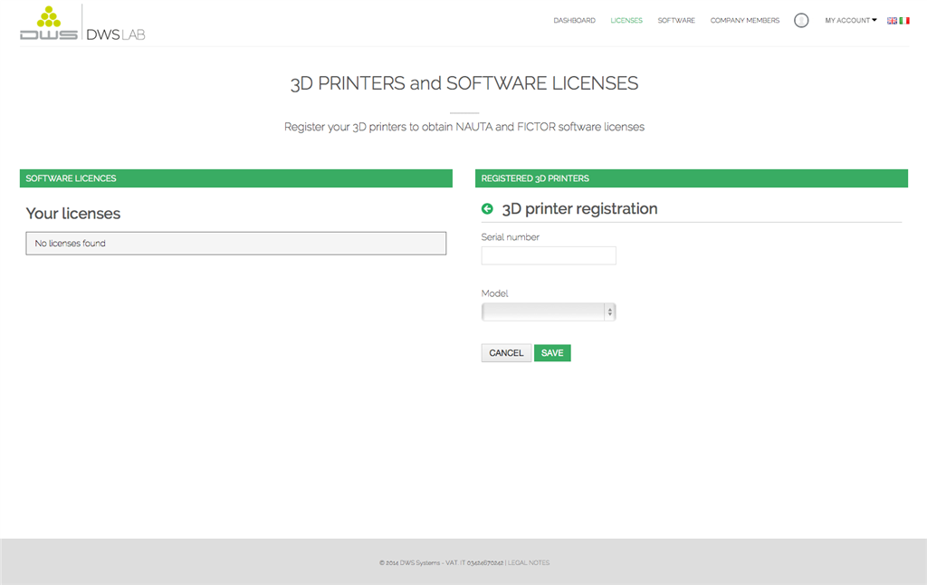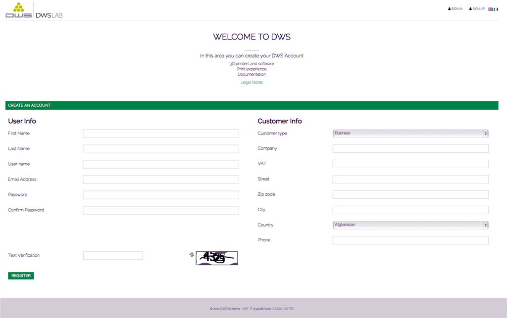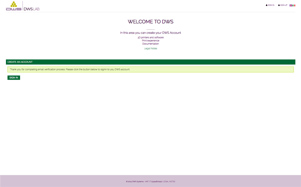 三、用戶註冊 1.前往customers.dwssystems.com頁面 2.點擊“Sign in”前往註冊頁面。 3.輸入所需的訊息,然後按照說明完成註冊。 4.打開註冊驗證郵件,然後點擊驗證連結。 5.點擊“Vertify”以完成註冊。 6.點擊“Sign in”。 7.輸入用戶名和密碼,然後點擊“Login”。 8.點擊“Register 3D printer”以註冊您的3D列印機。 9.在相對應的框框中輸入序列號(位於列印機背面的名牌上)和列印機型號,然後點擊“Save”。 10.如果打開列印機,則可以通過點擊“Save”將列印機與註冊用戶斷開。