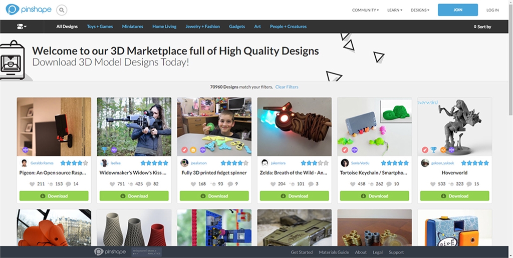 Pinshape集結70,000名3D模型愛好者,提供成千上萬的3D檔案,玩具模型、機械設備零件、珠寶、居家小物模型應有盡有!每個STL檔都可以進行3D列印,使用者不但能在平臺上分享、出售你的設計,也能簡單搜尋並下載各種模型。
