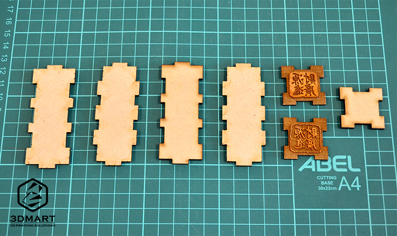 FLUX beambox在小尺寸2cm的印章上,雕刻出高解析度的效果、清楚呈現筆畫寬度只有1mm的毛筆字體,雷射切割拼圖結構只需要1分鐘、雕刻印章也只花5分鐘就完工。