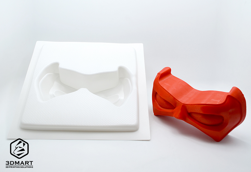 其中一個真空成型的關鍵是設計上可以考慮到的技術原理,在面具眼窩處有凹槽的地方可以看到總共四個小小的穿透圓孔;這個設計是在抽真空的過程中,讓空氣可以順利離開凹槽的氣孔,這能使凹槽處的殼模能更加服貼表面造型。