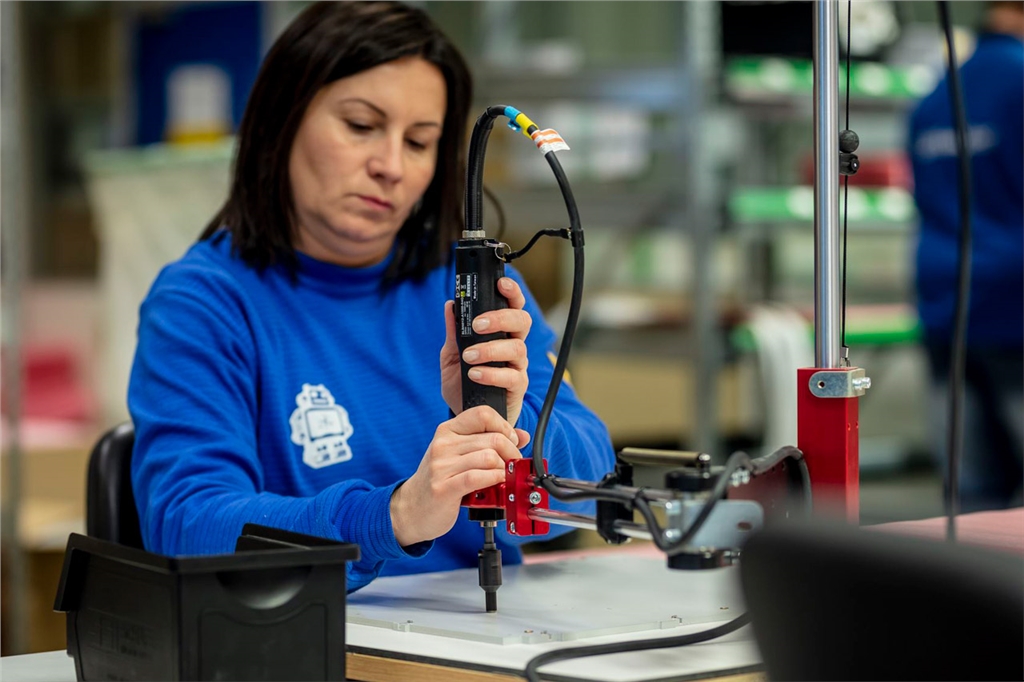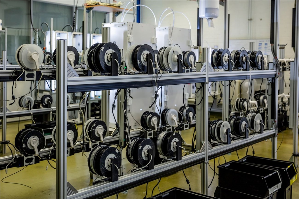 組裝一臺Ultimaker 3D列印機得從一塊外殼面板開始,在組裝前每個面板都配有軸承、螺母和各個元件。製程中的每個步驟都記錄在系統上,該系統在每個生產步驟的當下回饋相關數據,以便提高生產效率。