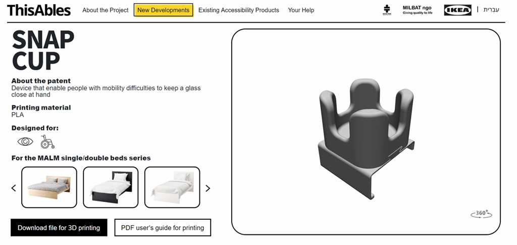 使用3D列印機可以實踐無限可能,而對於日常設計來說,以色列的Ikea宜家家居讓身障者的居家環境更舒適。這個計劃由以色列的Ikea與非營利組織Milbat合作,該組織專為身障人士提供技術,而「Access Israel」組織則是該國友善身障的促進者。ThisAbles平臺為身障人士提供一系列免費下載的3D列印「家具外掛」,與來自北歐的Ikea簡約風格及荷蘭的Ultimaker 3D列印機相呼應,讓許多熱門產品也對身障者更加友善。