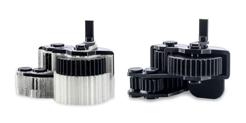 舒伯特公司(Gerhard Schubert GmbH)是頂載式包裝機「TLM技術」的先驅(點我看),生產許多自動化設備,常會需要可以組合、可動的工業零件,這類型的物件都會有較複雜的結構,同時對精度的要求也很高;以下這款可動的零件來說,結構上有四個螺絲、連動的輪軸,透過雙噴頭系統一次3D列印完成。