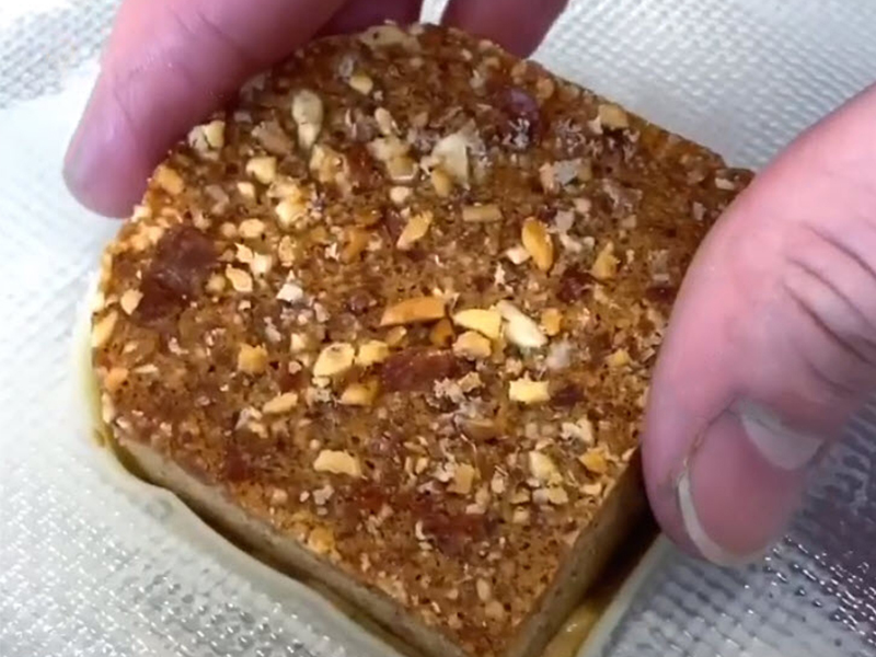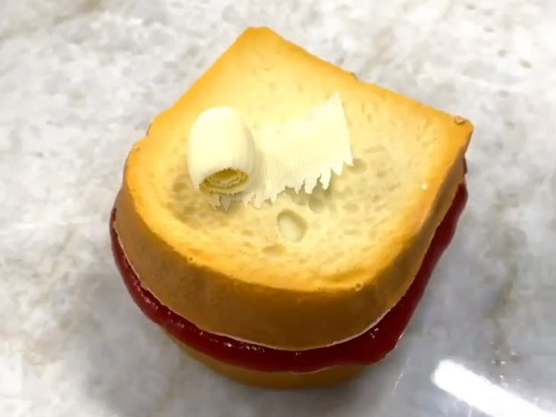 艾莫里師傅重複以上的動作,分別製作三明治外皮造型、核桃花生果仁糖的內(nèi)餡,並在周圍擠上草莓果醬,最後噴上甜點專用的食用噴漆,仿真程度超高;經(jīng)過簡單、快速的製作過程,美式經(jīng)典三明治的精緻甜點就完成了!