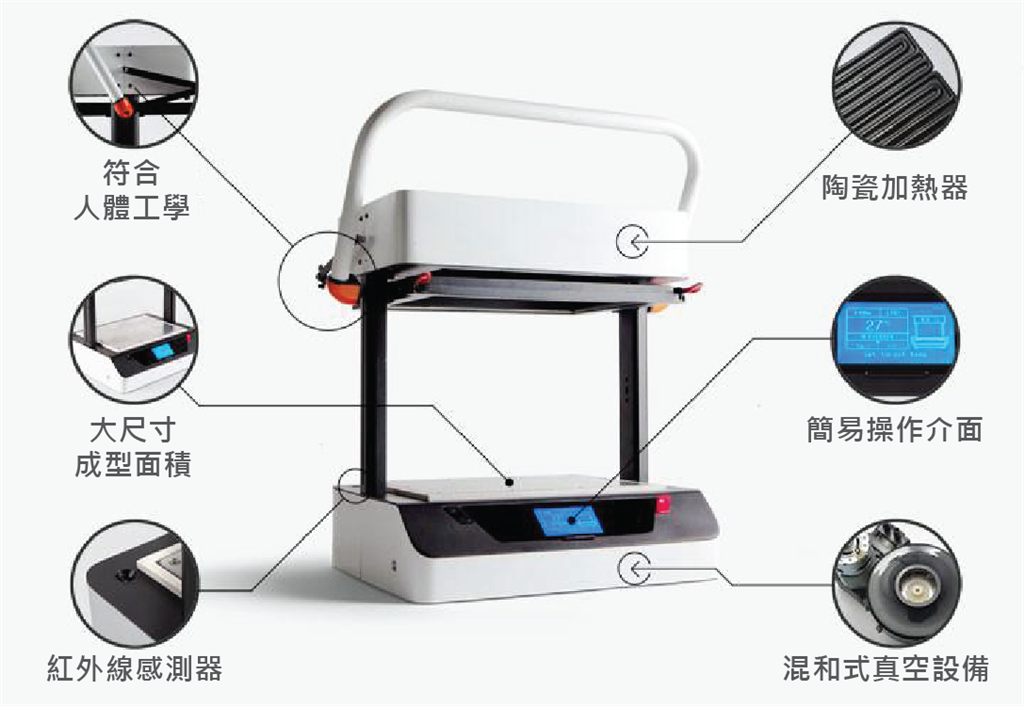 使用3D列印機列印產品原型後,再利用真空成型機進行殼模複製,能快速符合各種小型量產、開發產品、生產包裝等中小企業的運作形式。並且它的價格相對平實、體積精簡,也適合一般工作室、學校、創客空間自由使用。