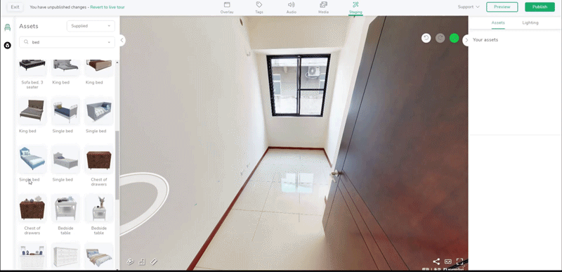 從左邊欄位的Assets挑選合適的家具,放置想要的位置即可,還可以針對家具的大小與旋轉(zhuǎn)進行調(diào)整,是不是超方便!