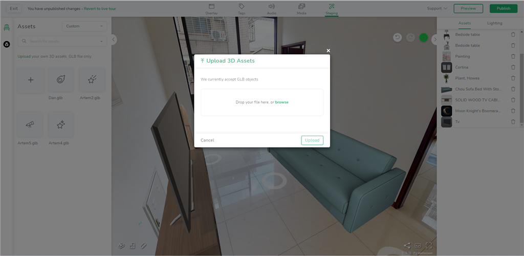 如果還是沒有找到滿意的素材,captur3d支援glb格式檔案,在Custom可以上傳。