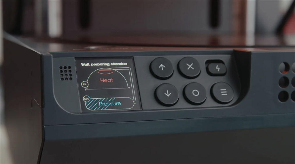 你會聽到壓縮空氣的聲音,過程中的成型壓力將高達(dá)五噸,自動冷卻過程結(jié)束後,壓力室中的空氣會被釋放出來。