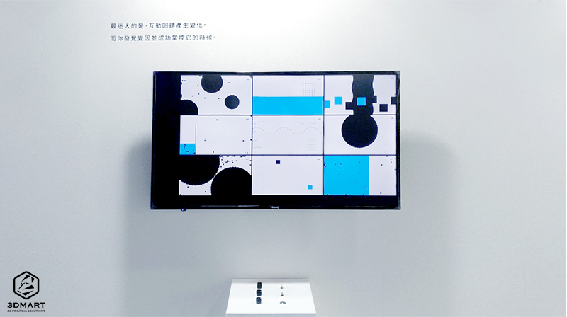展場入口處就有許多小巧思,觸控屏中的動畫會因為觀眾的調整產生不同的隨機律動。而籠子裡關著許多3D列印的「反應粒子」,代表著躍動不安、活潑的要素,仔細看共使用兩種不同的3D列印線材做出不同的反光效果。(延伸閱讀:北科互動設計展,消光線材搶先看!)