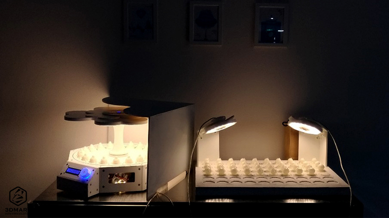 旁邊一一擺放的是角色的漸進動作(即動畫的單一「影格」),可以根據自己的喜好擺放觀看不同片段,透過自行放置及操作的過程為觀眾帶來參與感,自動閃燈變化的瞬間也令人非常驚喜。角色使用光固化進行3D列印,是在表面光滑度上最適合公仔製作的3D列印技術。(延伸閱讀:常見3D列印技術比較及整理)
