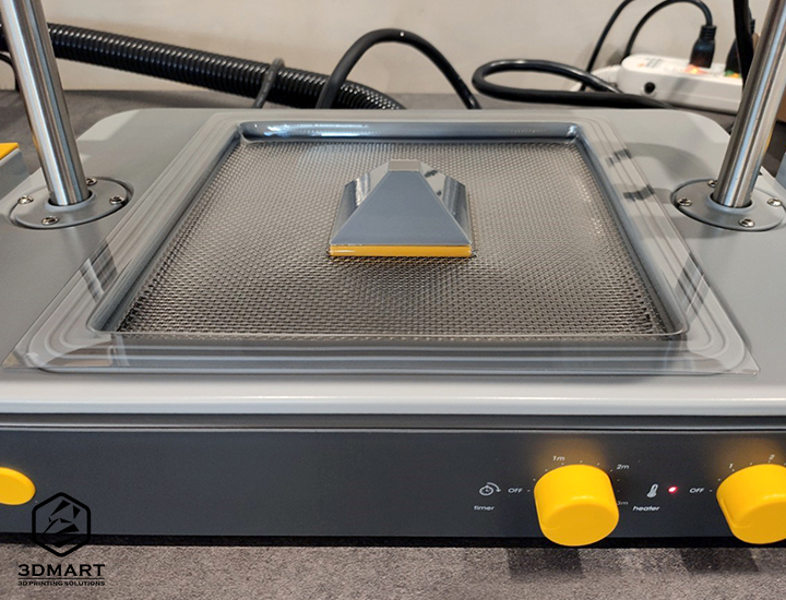 首先將成型材料片的薄膜撕除,放入FormBox後置於上方的加熱管加熱,到達所需溫度後FormBox會發出提示;這時將材料片下壓,連接的吸塵器會在下壓同時自動運作達到真空成型的吸塑效果。