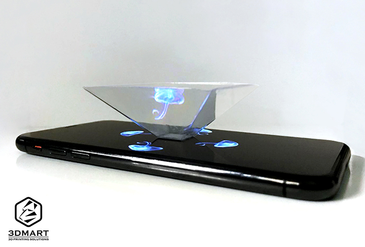 將這個四面體剪下,放在手機上就能自製出立體效果的「全息投影」,我們下載的立體水母有飄浮動態,第一次開箱就成功讓大家玩的不亦樂乎,各位也可以自己做一個試試看喔!
