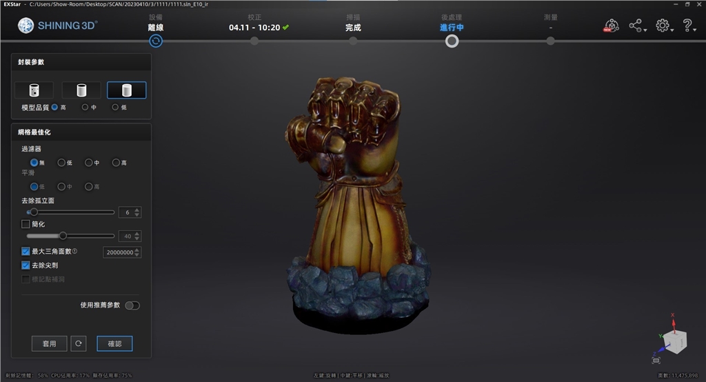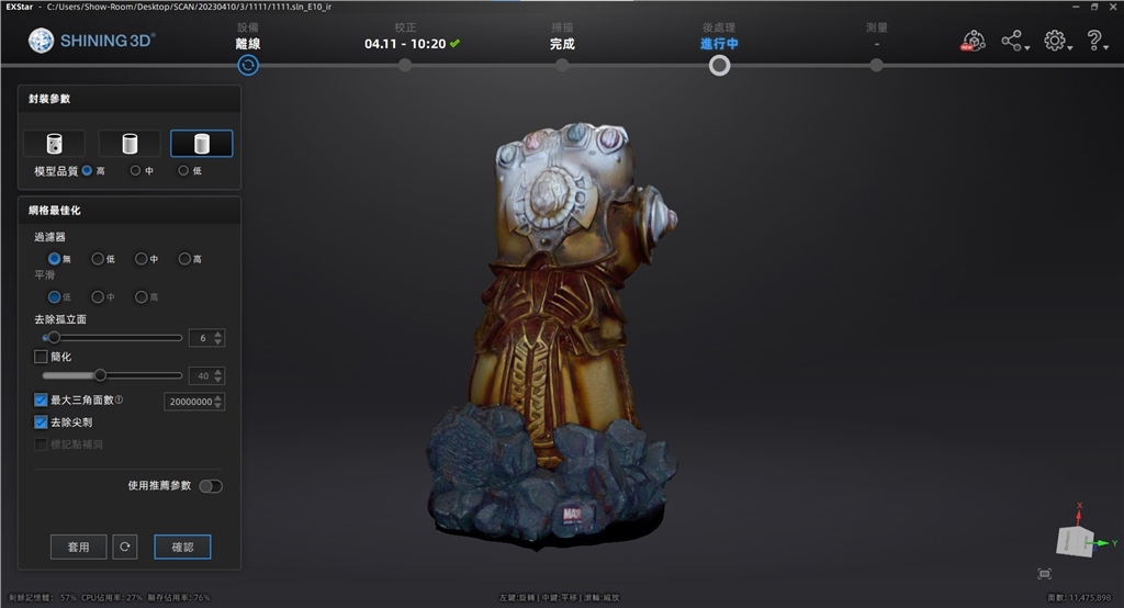 完成3D掃描的薩諾斯手套,可以看到複雜紋理的細節,從顏色上的多變、手指關節處、底座巖石紋理都高精度的完整成像,彈指的震撼完美還原!