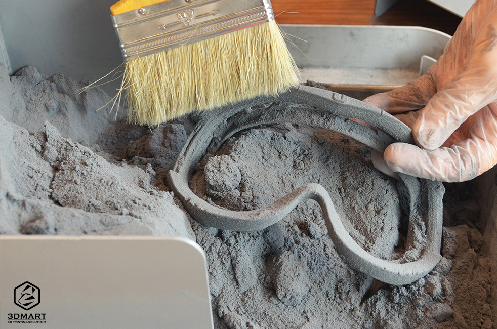 列印時間過後30分鐘等待機器冷卻,就可以開挖啦!由於粉末較細緻,有使用的各位清理的時候都建議戴上口罩喔!先將大塊面積的粉末剝離後,開始清理細節部分。再用刷子刷過後,已經可以將本體取出,Sinterit Lisa 3D列印機不需要使用支撐材料,只需要將粉末清除就是完成品,也不用擔心表面會有拆除支撐的痕跡。