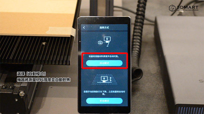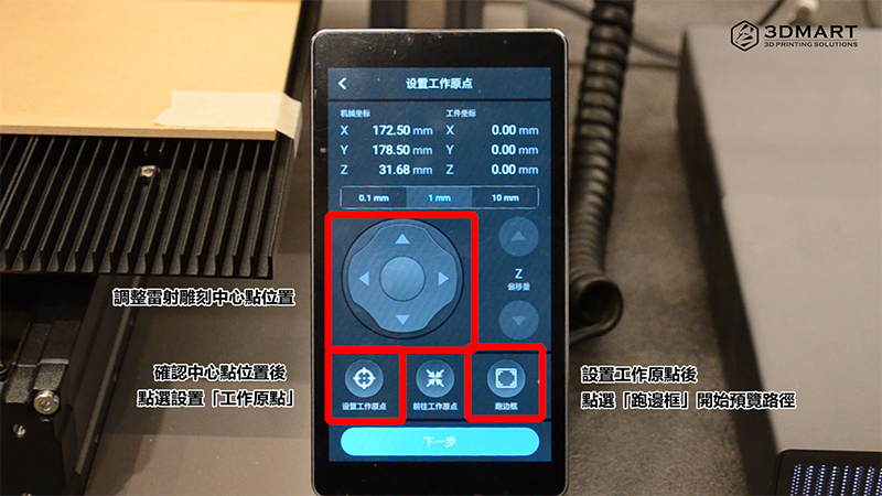 將雕刻材料固定於平臺中央,確認「對焦紅點」是否出現在物件表面,機器將自動偵測材料厚度,並將結果立即顯示在觸控螢幕上,確認材料厚度無誤,系統將自動完成對焦。開始雷射雕刻前,機器會以藍光預覽雕刻路徑,使用觸控螢幕上的箭頭,調整藍光位置直到符合需求的位置,設定3步驟: