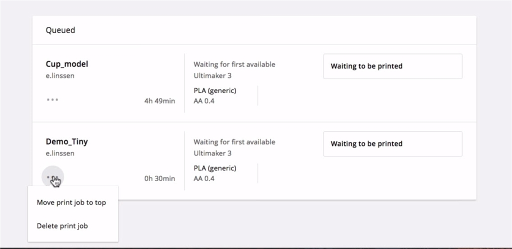 6. 選單中可選擇「Move print job to top」與「Delete print job」,可依照需求調(diào)整3D列印作業(yè)的順序。