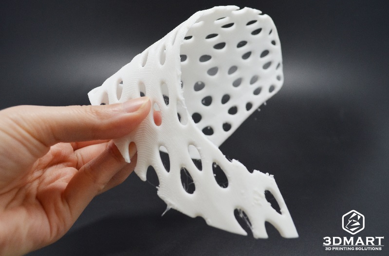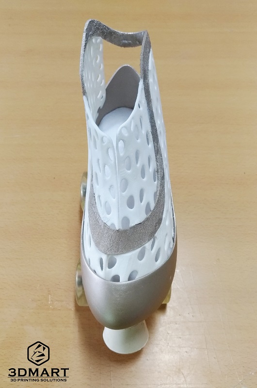 【3D列印應用】新潮設計3D列印鞋款 3D列印的應用方式非常多,像是公司開發商品原型時會利用3d列印技術,有些學校也會使用3d列印機來輔助生產 教材或完成學生的設計想法。 這次3DMart收到來自大學的工業設計系學生的3d列印代工委託,幫助完成他們的設計構想,他們剛好都是設計鞋 款,各具不同的特色,我們將於此篇文章向大家介紹他們的設計歷程。 第一個的黃色設計款女用鞋是李同學的作品,主要是為了畢業專題所製作的作業,設計的靈感結合樹根、骨骼密度 的造型以及網狀的血管,是一款十分優雅的新穎設計女士鞋款,鎖定25-35歲具時尚感的輕熟女族群 李同學表示會使用3d列印技術完成此鞋款,是因為此鞋子模型在造型上很複雜並且要求高細緻度,在製程上面選擇 3d列印機印製也比較簡單,並且在最終完成度也很高。 由於設計上有許多鏤空的部分,必須使用Ultimaker3雙噴嘴3d列印機,讓PLA搭配水溶性支撐材PVA,不須擔心有 拆不完的支撐以及支撐拆除後的粗糙表面。 在Cura的設定上我們盡可能地將PVA的用量調至最低,避免材料的浪費並節省泡水的時間,總共的列印時間約為2天。 圖為正在3D列印的黃色女用鞋 (列印層厚:0.15mm 填充率:30%) 這次決定設計鞋子作為畢業製作是來自老師的提議,由於聯合大學工設系所在工專時期是以鞋子設計為主要項目, 後來才轉變為以產品設計為主,此次有種想重拾初衷再次挑戰過去鞋子設計的強項。