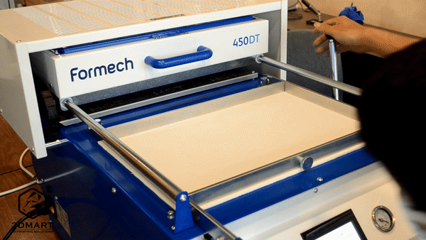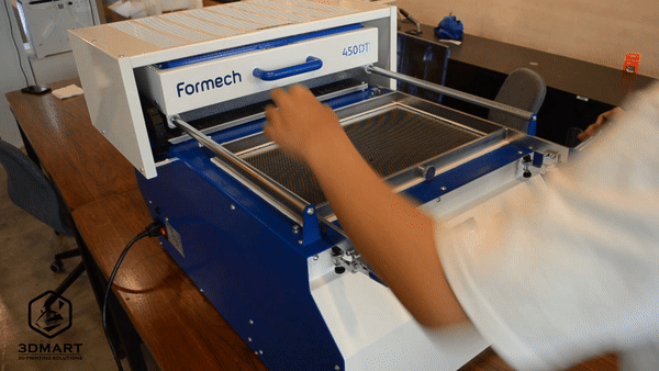 一切準(zhǔn)備就緒後,將手柄往前下壓,工作平臺(tái)就會(huì)往上移動(dòng)貼近材料片,這時(shí)候只要按下吸塑按鍵就能快速、不費(fèi)力的完成真空成型;Formech 450DT的自動(dòng)脫模功能,機(jī)器會(huì)自動(dòng)將材料片吹離模具,直接一鍵脫模!