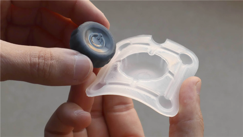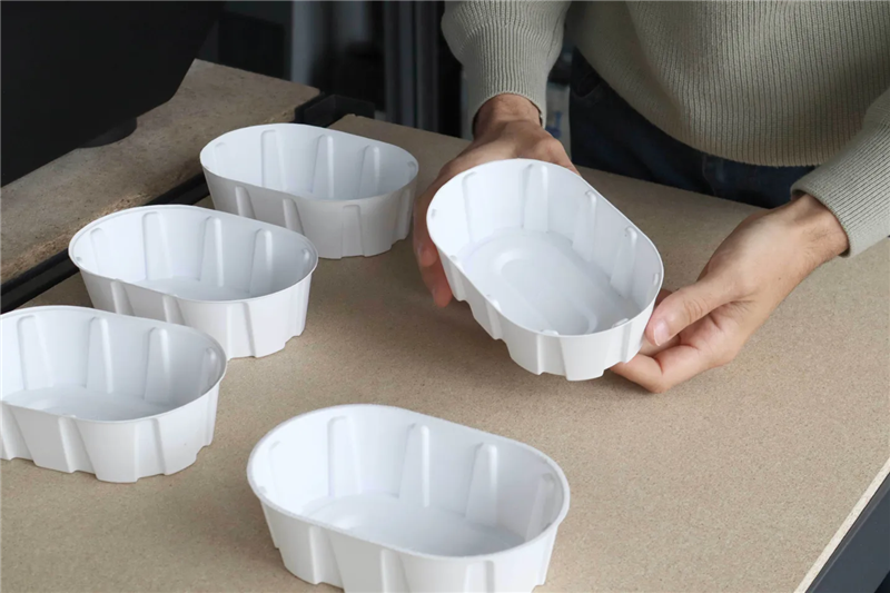 The plastic sheet is first placed in the press machine above the mould. Heat is applied from above. When the correct temperature is reached, compressed air forces the sheet onto the mould. A vent allows the air to escape. Once sufficiently cooled and hardened, the plastic sheet is removed from the mould, creating a plastic shell that can be modified and adjusted to meet specifications.