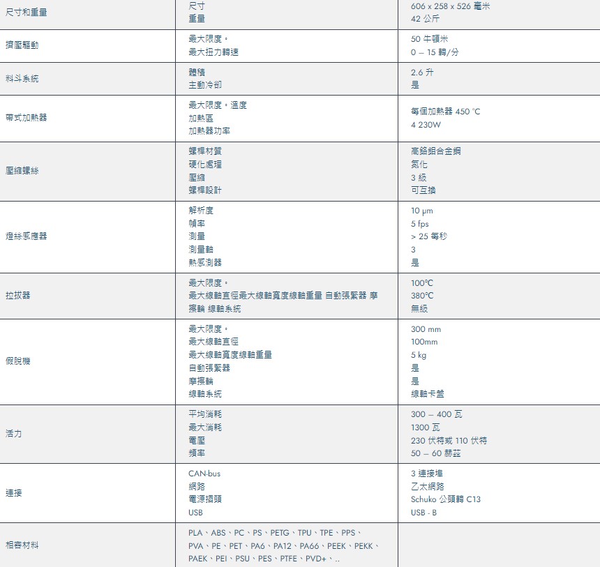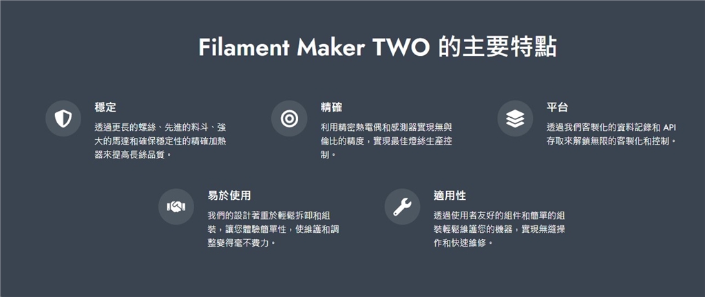 提高穩定性 使用 Filament Maker TWO體驗終極的穩定性和性能。它旨在提供一致的線材質量,是您先進長絲擠出的完美伴侶。特點包括: - 高馬達扭矩 - 最佳化加熱 - 提高壓縮比 - 更優化的LD比率