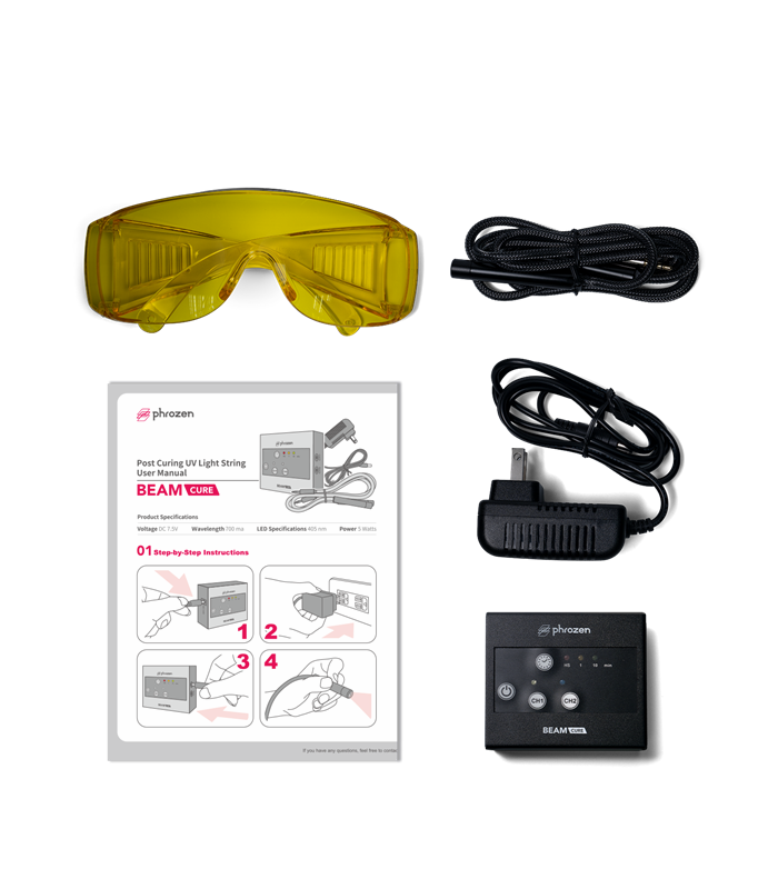 Phrozen Cure Beam : Post Curing UV Pen Phrozen Cure Beam是一款專為模型後處理設計的可手持光固化UV燈筆。體型輕巧,筆長僅有62公釐,可以深入模型中空造型裡的內部空間,固化在一般固化燈運作時沒有照射到的區域。 使用光固化UV燈筆可以重複照射樹脂並強化細節處理,使模型成品更加平整光滑,不用擔心因為模型固化不全而導致模型龜裂與斷裂。小巧便攜的燈筆可以輕易收納,不僅操作簡單,還可以自由固化任何細節,是3D列印模型的超強勁助手! Phrozen Cure Beam:光固化UV燈筆內容物: .控制器 .UV燈筆2支 .電源線 .護目鏡 *使用光固化UV燈筆時,請戴上手套做防護準備。切勿直視光源、照射眼睛,可能造成永久性傷害。 如果您正在使用或準備購買Phrozen 光固化 3D 列印機,Phrozen Cure Beam 光固化UV燈筆絕對讓您愛不釋手。馬上聯絡我們了解更多有關Phrozen系列產品的詳細信息吧!