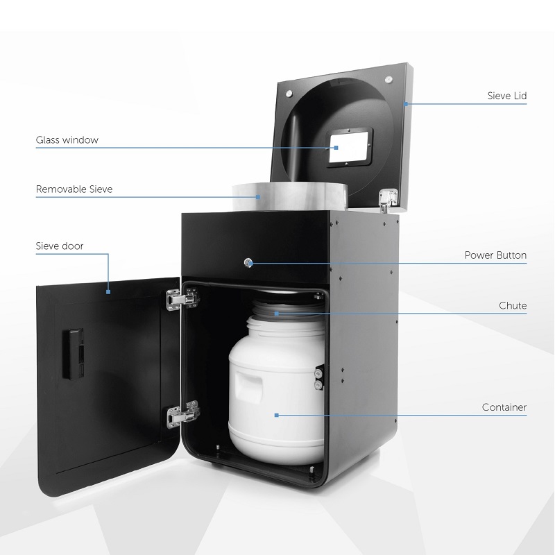 Clean the powder retrieved after the printing (unsintered powder from the Print Bed with the powder remaining in the Source and Overflow Bin), filtering out clumps and other contaminants in an easy way. After cleaning the material is ready to mix with Fresh Powder and re-use to print other objects.