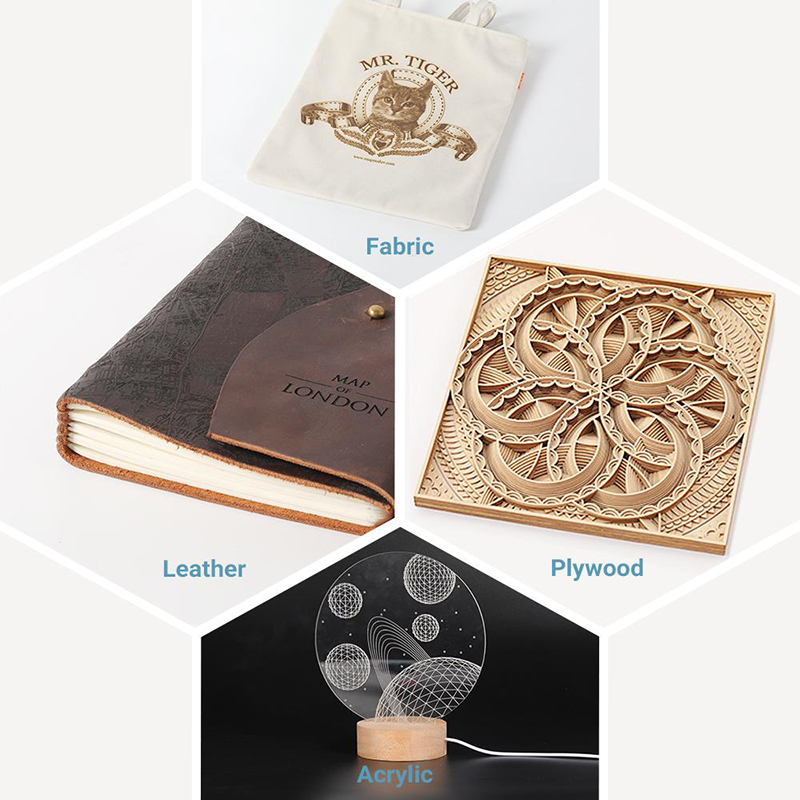 Combining the three technologies can have a lot of applications in daily life. You can work with paper, acrylic, leather, cloth, and even engrave exclusive patterns on biscuits or toast!