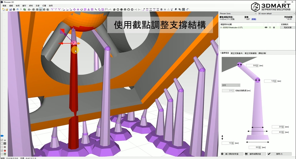 支撐結構如果和3D模型重疊,軟體會自動偵測並以「紅色」顯示錯誤,在切片開始前再三檢查並使用截點調整,可以有效節省樹脂的使用量、提高完整度。