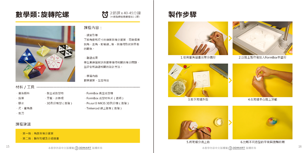 自製戰鬥陀螺!透過量角器畫出等分的圖形,以黏土進行真空成型後,剪下外殼、黏上牙籤後,將陀螺依照喜好上色;藉此能了解角度和尺寸的等分運算,在學習數學的同時搭配設計樂趣,讓學習之路更有趣深刻。