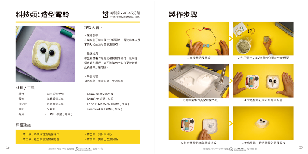 使用黏土或3D模型搭配真空成型製作電鈴的外殼,放入串接電路和電鈴後結合電鈴造型,除了可以了解電路、電流科學,也能進階學習如何更換電鈴聲,製作獨一無二的電鈴。