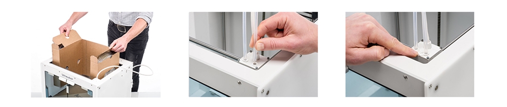 3. 將左邊的遠端進料管(Bowden Tube)插入左邊對應的進紙器,右邊的遠端進料管(Bowden Tube)插入右邊對應的進紙器。