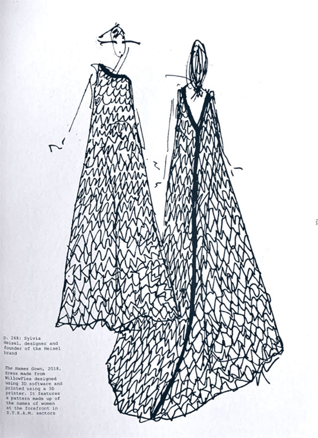 希爾維亞親手寫下300多個業界女性的名字,並與3D建模程式「Morphi」的創始人.Sophia Georgiou和「Ultimaker」的推廣人.Liz Arum合作,以可堆肥的材料搭配Ultimaker 3D列印機將每個名字相互連接而成,這樣獨特的衣料是以往傳統紡織業沒辦法做到的!