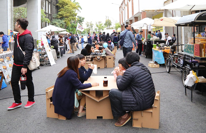 連週邊販?zhǔn)鄄忘c(diǎn)的攤位使用的都是可回收的厚紙板桌椅,十分融入「大港自造節(jié)」的主題,也吸引大家躍躍欲試;現(xiàn)場實(shí)測堅固度媲美一般塑膠桌椅,結(jié)構(gòu)緊實(shí)且重量很輕,希望未來能廣泛應(yīng)用。