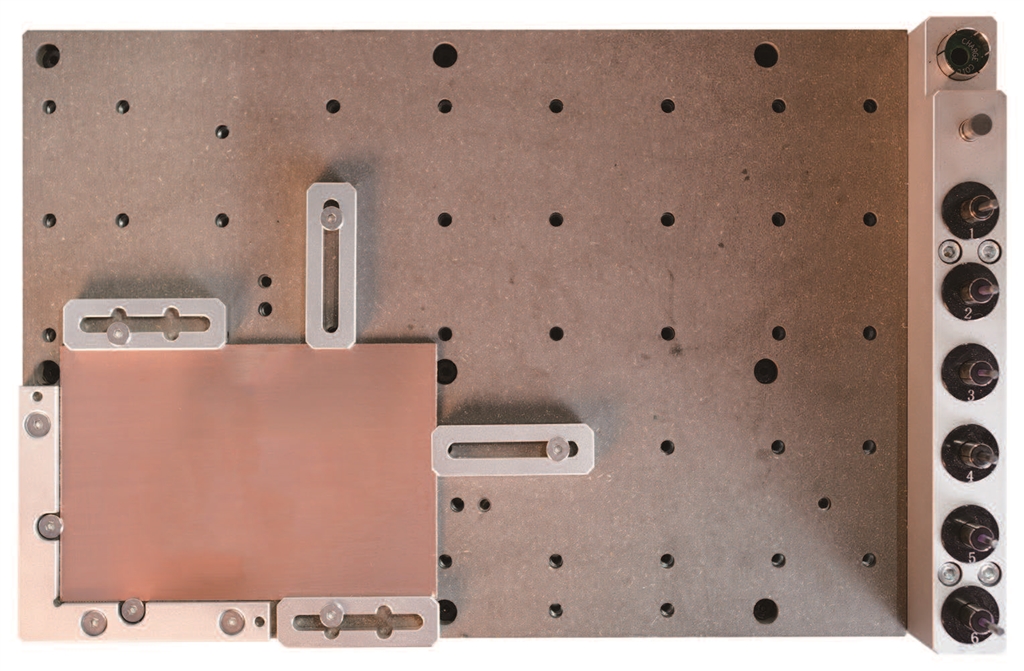 2. 將鋁合金板和廢板固定到工作臺上,如圖所示。對齊到錨點1的L型支架。