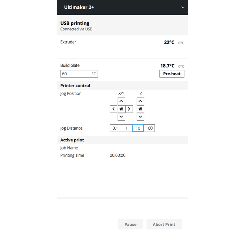 現在可以通過Ultimaker Cura完全控制。每個軸可用0.1,1,10和100mm增量進行運作。