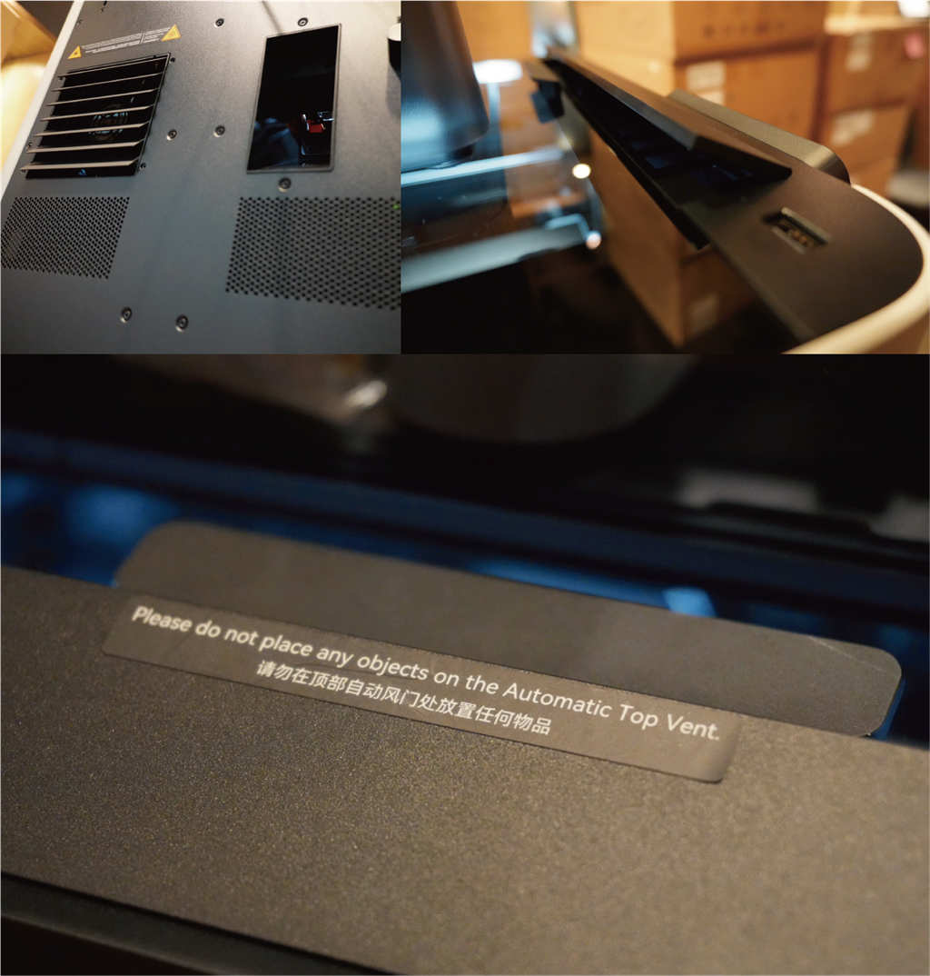 在機(jī)身後方以及機(jī)身頂部的通風(fēng)口,在進(jìn)行列印時會自動開啟,有效進(jìn)行溫度與空氣控制。